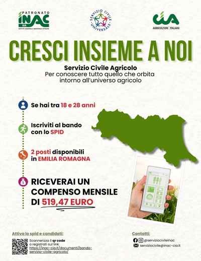 Inac, per la prima volta, in stretta collaborazione con Cia, Confederazione Italiana Agricoltori, partecipa alla progettazione del Servizio Civile Agricolo con 2 progetti per un totale di 57 posti in 16 regioni di Italia, due posti sono assegnati all’Emilia Romagna. Il bando è attivo fino al 15 ottobre alle ore 14.00.