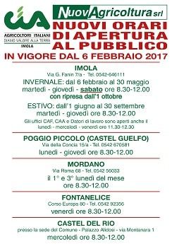 Imola, via Fanin 7/a, tel.0542646111, invernale dal 6 febbraio al 30 maggio il martedì, giovedì e sabato ore 8.30-12.00 con ripresa dall’1 ottobre. Estivo dall’1 giugno al 30 settembre martedì e giovedì ore 8.30-12.00. Gli uffici CAF, CAA e Datori di lavoro sono aperti anche il lunedì, mercoledì e venerdì ore 11.30-12.30.