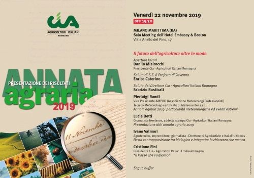 Venerdì 22 novembre a Milano Marittima (Ra), alle ore 15.30 nella Sala Meeting dell’Hotel Embassy & Boston, Cia Romagna presenta l’Annata Agraria 2019.
